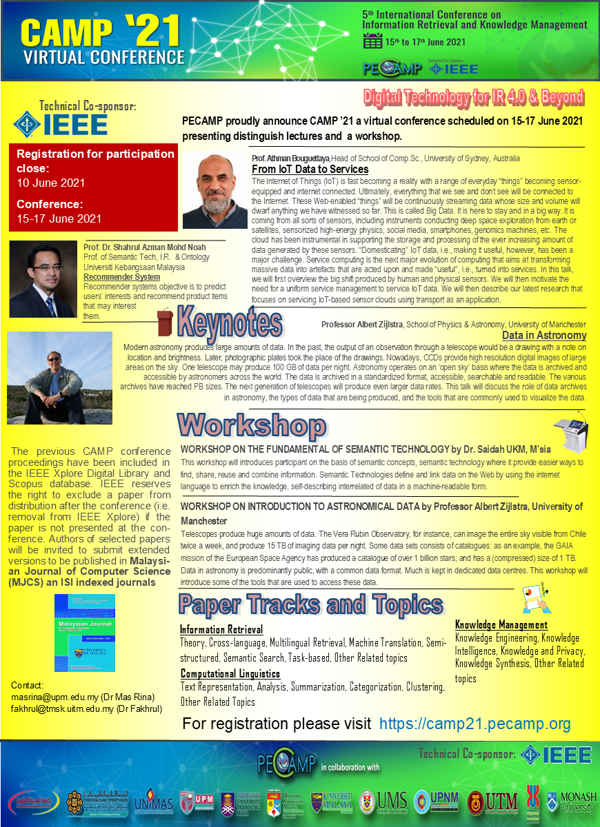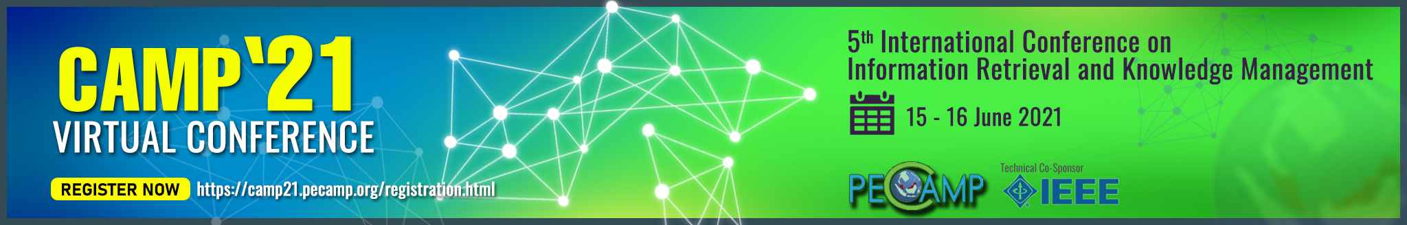 CAMP’21, the Fifth International Conference on Information Retrieval and Knowledge Management is organised by PECAMP, the Malaysian Society of Information Retrieval and Knowledge Management. CAMP’21 is the premier international conference for the presentation of new research results and for the demonstration of new systems and techniques in information retrieval and knowledge management. The conference consists of three days of full papers, tutorials and workshops focusing on research and development in the area of information retrieval and knowledge management, as well as an industry track and social events. Conference proceedings will be submitted for inclusion into IEEE Xplore as well as other Abstracting and Indexing (A&I) databases. Authors of selected papers will be invited to submit extended versions to be published in Malaysian Journal of Computer Science (MJCS) an ISI indexed journals*. The previous CAMP conference proceedings have been included in the IEEE Xplore Digital Library and Scopus database. IEEE reserves the right to exclude a paper from distribution after the conference (i.e. removal from IEEE Xplore) if the paper is not presented at the conference. Proceedings of the CAMP’10, CAMP’12, CAMP’16 and CAMP’18 can be accessed through IEEE Xplore Digital Library. |